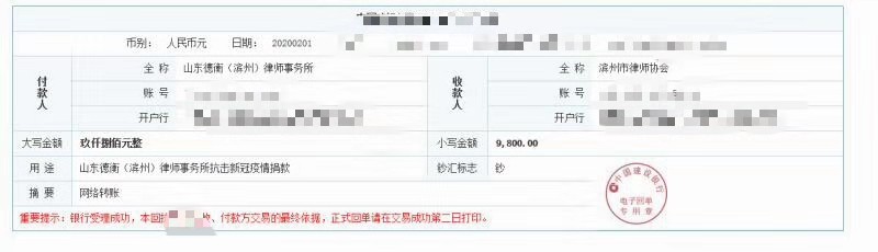 本所各位律師工作人員積極響應號召,2000元、1000元、500元、300等等,根據個人不同情況,紛紛獻出愛心,倡議發(fā)出僅一天時間,就募集資金9800元。善款收齊后,由律所統(tǒng)一交濱州市律師協(xié)會代為捐贈。